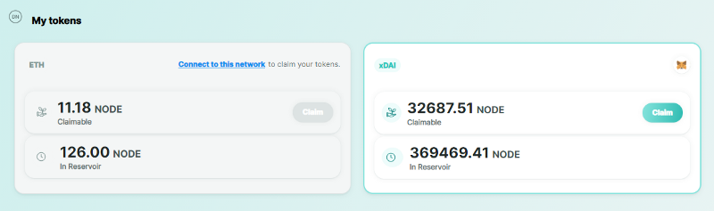 Recipients of the NODEdrop on xDai Network are granted the NODEstream, whereas on Mainnet the NODEdrop does not include the NODEstream automatically. In order to receive and augment the flow of NODE you must provide liquidity in any of the eligible pools. Some part of the rewards earned from NODEstaking are claimable immediately, where as the other part is allocated to the reservoir for NODEstreaming.