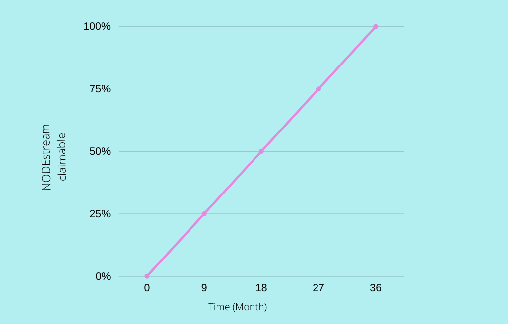 The NODEstream works on a time-based linear function, meaning the reservoir will gradually hold a smaller percentage of your NODE and thus more NODE is made instantly available from your staking rewards. At the end of the NODEstream The reservoir will no longer hold any NODE and 100% of your staking rewards will be instantly claimable.