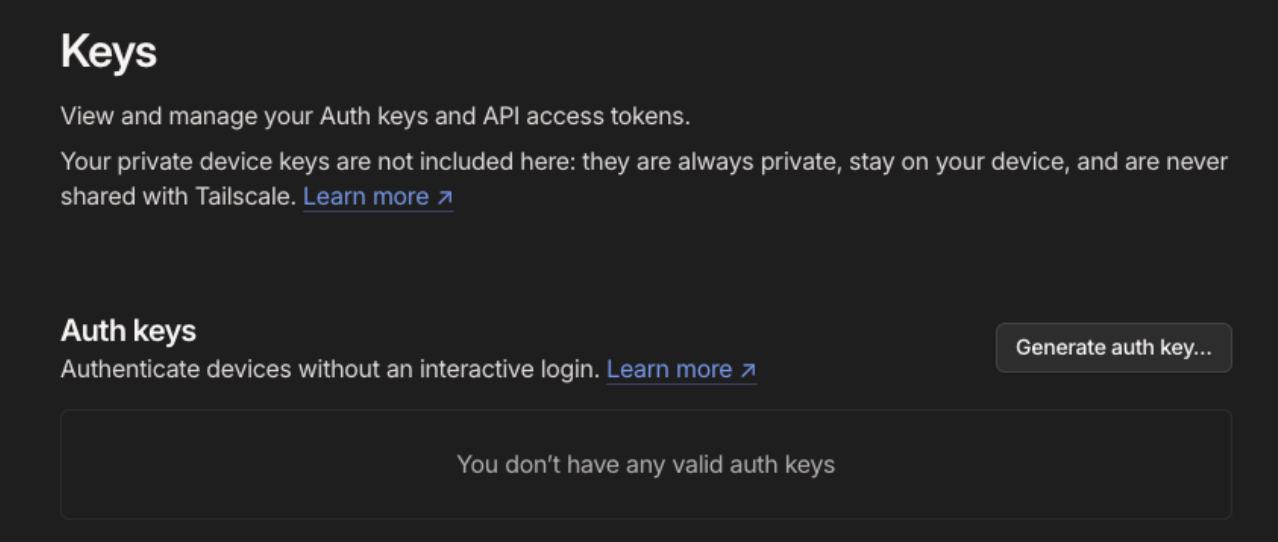 - Log in to Tailscale and navigate to Tailscale Admin Settings. Click on Generate auth key.