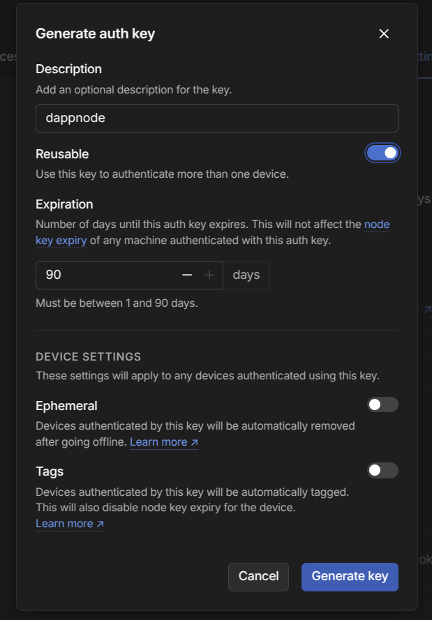 - Create a new auth key. Any name will work. We recommend activating the "Reusable" option so you can use the same key multiple times.