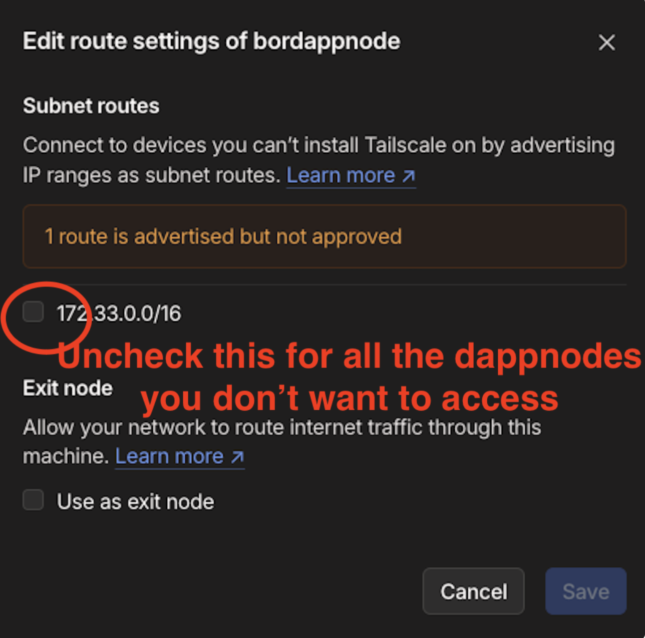 Dappnode advertises its internal networks through Tailscale, allowing you to access services like the Dappnode Admin UI and other packages. To ensure these routes are accepted: