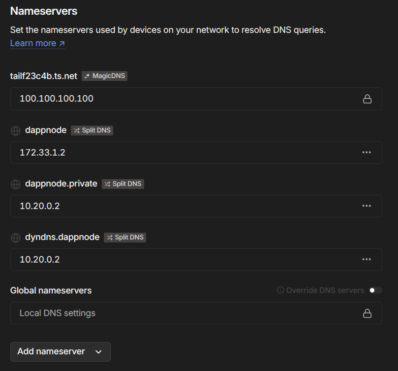 The following screenshot shows a configuration that only uses Dappnode's DNS server for services under the dappnode, dappnode.private and dyndns.dappnode domains, while using the default Tailscale DNS server for everything else.